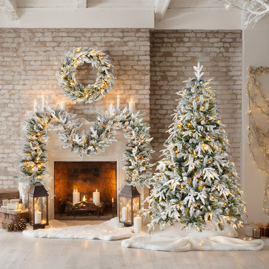 Christmas Snow Flocked Wreath with Xmas Snow Garland and Snow Xmas Tree, 3 Pac Snowy Flocked Christmas Decor with Warm LED Lights, 9ft Flocked Garland, Flocked Wreath, 6ft Flocked Tree