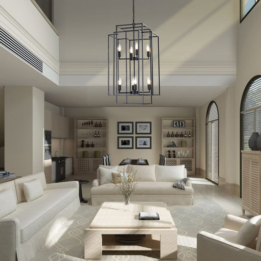 (Same as W1340142527/L1018-B) 18' Modern 8-Light Black Geometric Pendant Chandelier, Industrial Metal Frame, Adjustable Hanging Light for Living Room, Dining Room, Kitchen (No Bulbs)