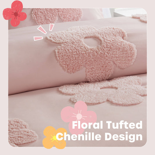 3-Piece Full/Queen Floral Reversible Tufted Chenille Duvet Cover Set,Pink