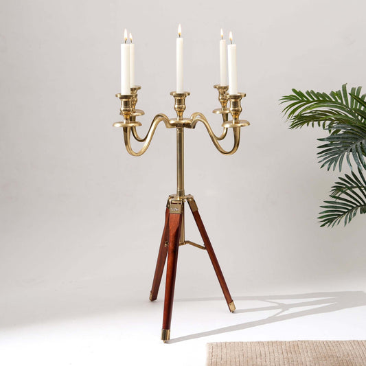 Elegant Tripod Candle Holder – Gold Polished Aluminum with Wood Detailing (17x17x31')