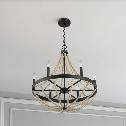 Starry Wood Chandelier Farmhouse Six Candle Light Wood Beaded Black Pendant Light for Dining Room