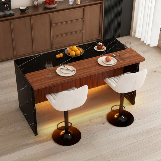 63-inch Modern Kitchen Island Set with 2 Dark Brown Bar Stools - Black Marble Look Surface, LED Lighting & Grill Design for Dining Room, Open Concept Spaces, Lounge(2 Dark Brown Bar Stools)