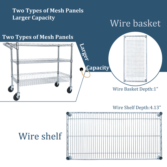Heavy Duty Rolling Utility Cart,3 Tier Rolling Carts with Wheels,with Handle Bar & Shelf Liners,36'x18'x32'Storage Cart for Kitchen,Restaurant,Plant Display,Chrome