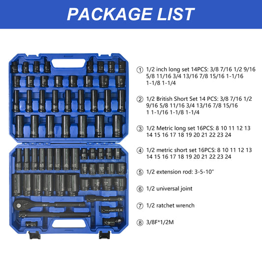 Air Tool and Accessories Kit, 66 Pieces, Long and Short Sets, Universal Short Sets, Extension Rods, Universal Connectors, Ratchet Wrenches, -Black,Blue