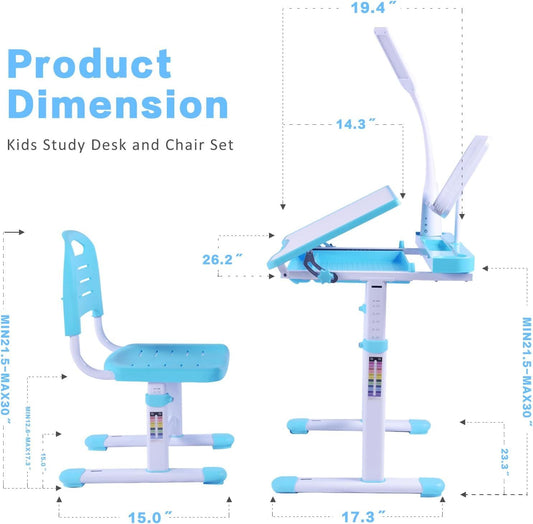 Desk for Kids Desk and Chair Set Kids Art Desk Drafting Table Desk Set with Adjustable Height, 40-Degree Tiltable Children Desktop, LED Light,Bookstand,Blue