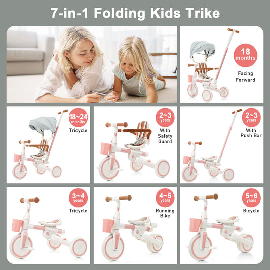 7 in 1 Baby Tricycle, Toddler Tricycle with Removable and Adjustable Push Rod, Toddler Push Bike with Removable Pedal, Canopy, and Guardrail, Tricycle for 18-72 Months, pink