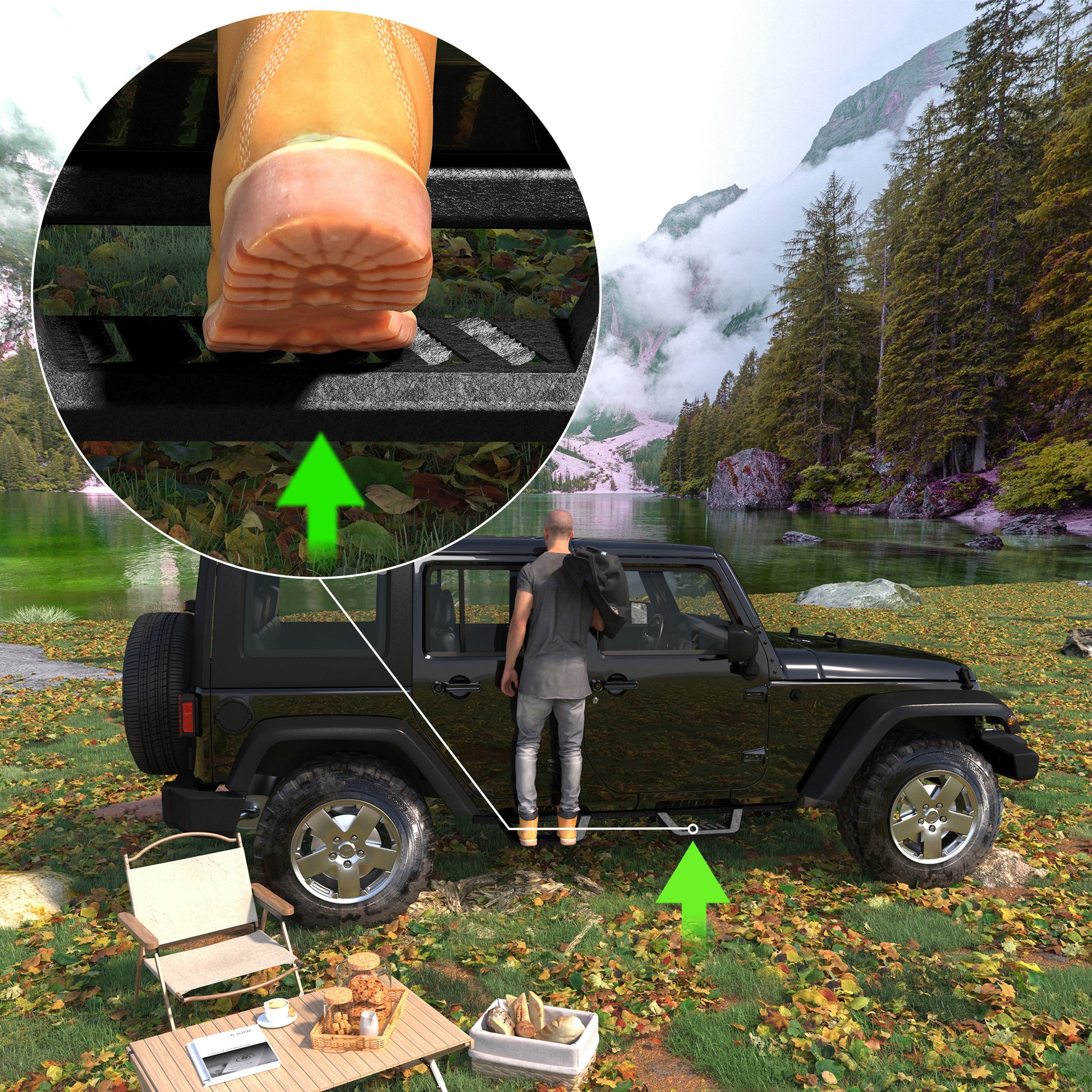 • Strong & Durable: Our running boards are built to last, with a unique powder coating that resists rust and corrosion. The laser-cut step plate offers a non-slip surface and reinforced grip, supporting up to 700 lbs. without bending.