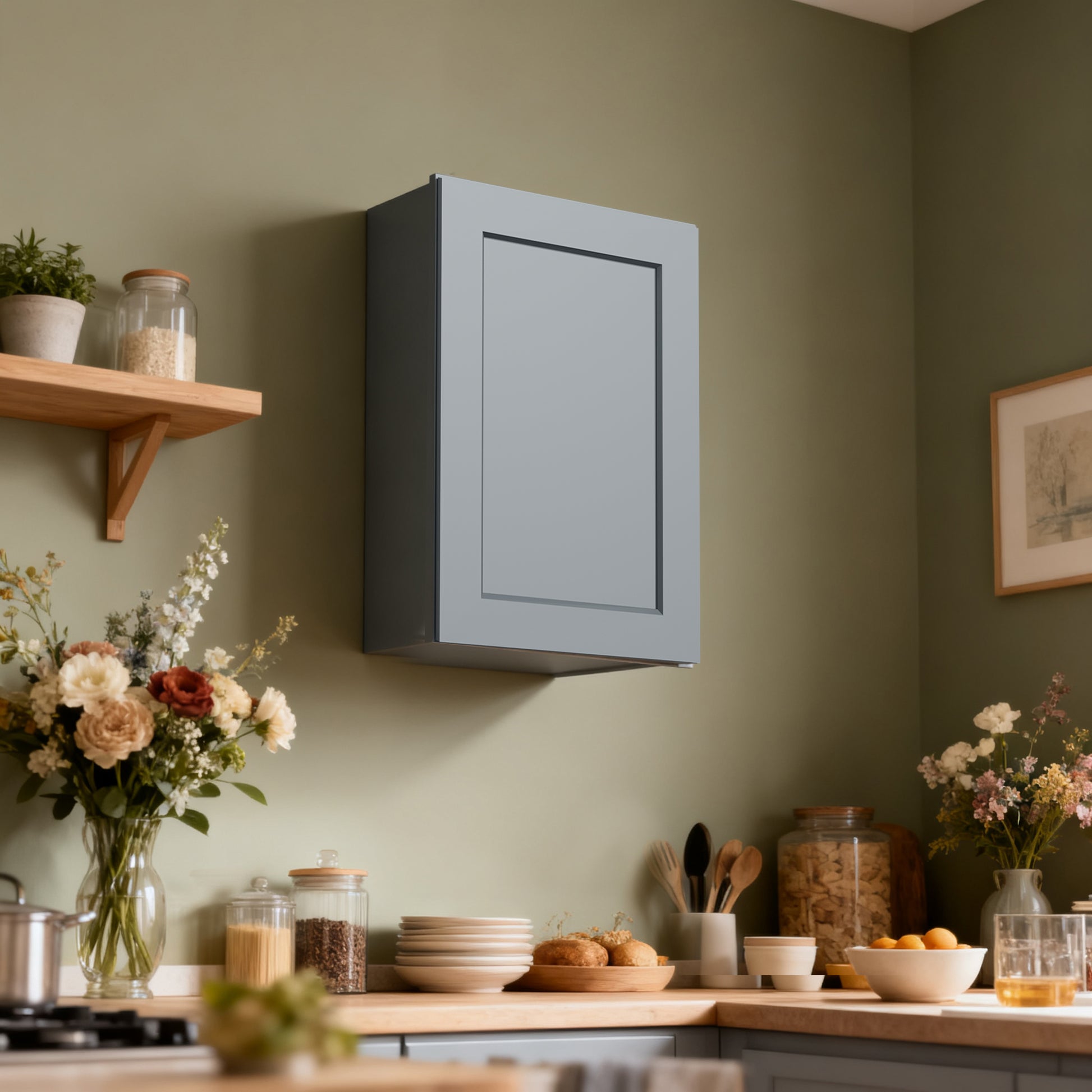 Dark Gray Solid Wood Single Door Wall Cabinet 1 Door and 2 Shelves for Kitchen Storage, Bathroom Storage, Laundry,Adjustable Shelves Ready to Assemble(21'W×12'D×30'H)