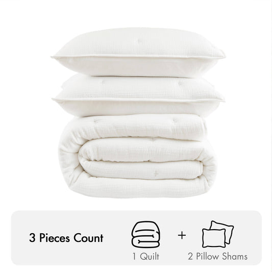 3-Piece Full/Queen Cotton Gauze Embroidered Quilt Set,White