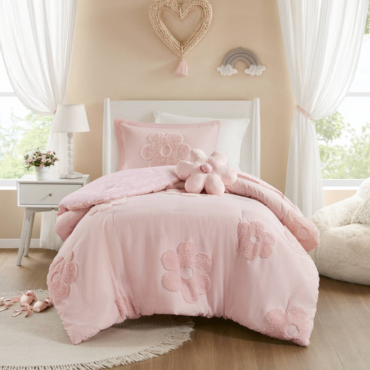 3-Piece Twin Floral Reversible Tufted Chenille Comforter Set with Flower Throw Pillow,Pink