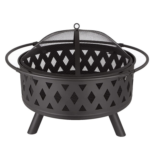 Round fire pit with net cover, fire poker, diamond mesh, metal wood burning outdoor fire pit, suitable for courtyards, backyards, gardens, bonfire parties, Christmas, Thanksgiving, Halloween
