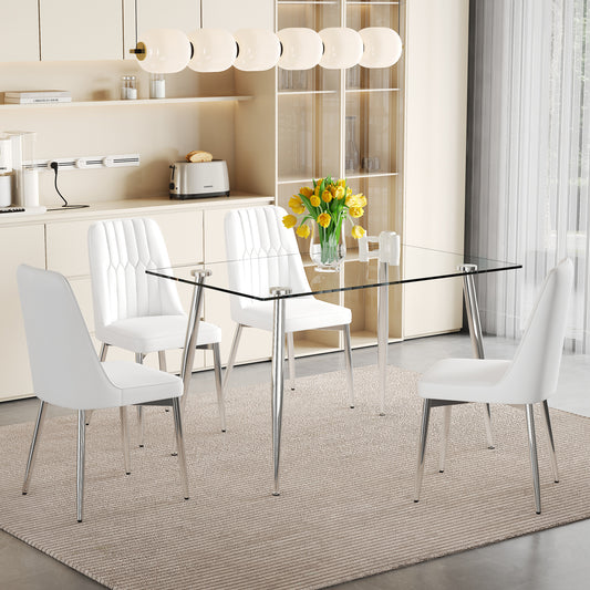 Table and chair set.Modern Luxurious Rectangular Tempered Glass Dining Table Set.Paired with 4 White Chairs With PU Cushions And Silver Metal Legs.