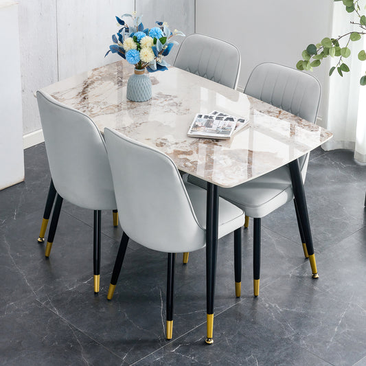 Table and chair set.48.4*28 Inch White Sintered Stone Dining Table Set - 4 Light Gray chairs with PU cushions and black metal legs.