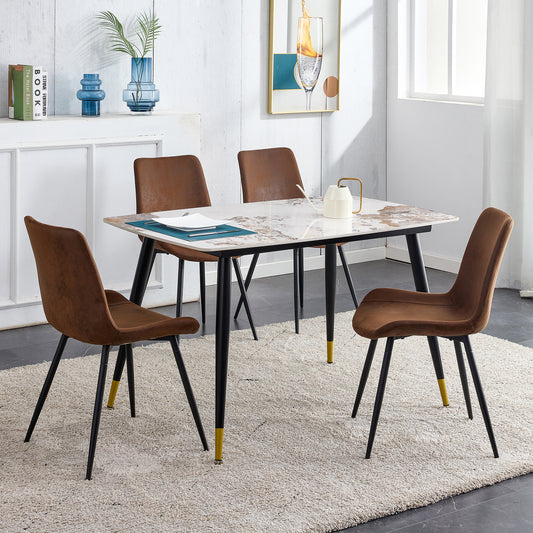 Table and chair set.48.4*28 Inch White Sintered Stone Dining Table Set - 4 Brown and Light Gray Spliced Color PU Dining Chairs.