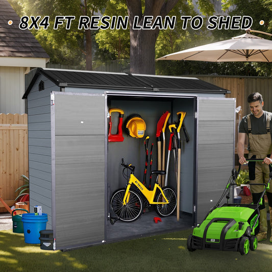 8x4ft Outdoor Resin Garden Shed with Floor and 2 Windows, Plastic Patio Outdoor Storage Shed with Lockable Door for Garden Tools, Bicycles, Trash Cans, Gray+Black