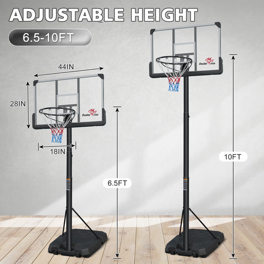 DOUBLE FISH[Adjustable Basketball Goal] Height Adjustable 6.5 Ft-10 Ft Basketball Hoop - 44'' Basketball Rebound, Portable Wheels, And Sturdy Base - Rust-Proof For Adults And Youth
