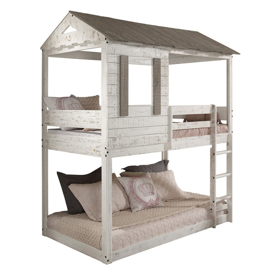 Rustic White Twin Over Twin Bunk Bed with Built-in Ladder