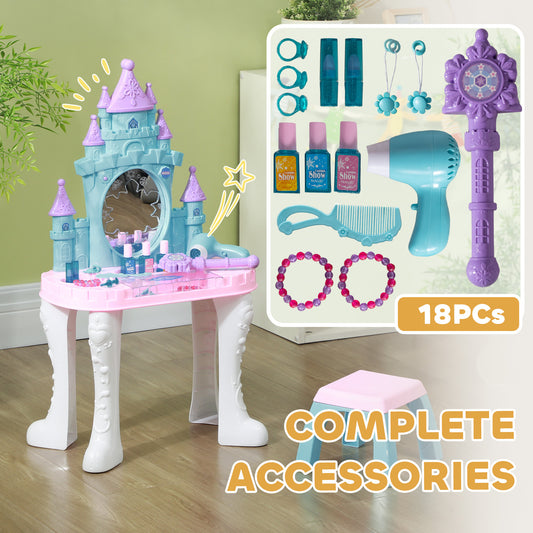 Qaba Kids Vanity Set with Mirror and Stool, Castle Design Makeup Table with Light, Music, Hair Dryer, 18 Accessories, Girls Pretend Play Toys for 3-6 Years, Multicolor