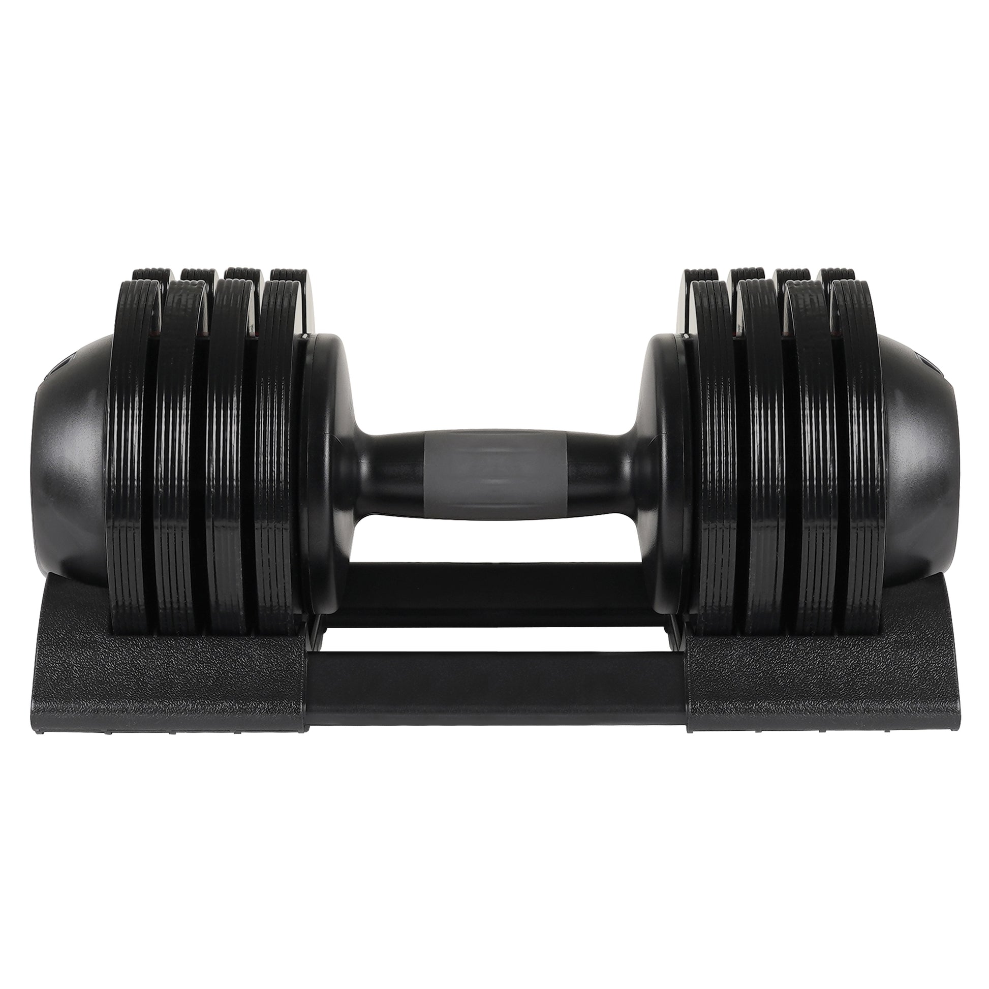 ADJUSTMENT RANGE:3LBS,16LBS,28LBS,40LBS,52LBS STRENGTHENING PERFORM ALL EXERCISES IN A CONTROLLED MANNER. BE SURE TO SYNCHRONIZE YOUR BREATHING CORRECTLY: BREATHE OUT WHEN TAKING THE STRAIN AND BREATHE IN WHEN RELEASING PRESSURE. IMPROVING STAMINA: CONSIDER PERFORMING AN EXERCISE UP TO 15 TIMES(REPETITIONS) SET AND THEN 3 TO 5 SETS I.E. 10 REPETITIONS 3 SETS WITH A REST BETWEEN EACH SET. IMPROVING MUSCLE MASS:CONSIDER PERFORMING AN EXERCISE AT LEAST 6 TIMES(REPETITIONS) SET AND THEN 3 TO 5 SETS I.E. TAKE A SHORT BREAK OF 1 TO 4 MINUTES BETWEEN EACH SET OF EXERCISES. 3-5 TRAINING SESSIONS A WEEK,WITH A DURATION OF 20-40 MINUTES,IS RECOMMENDED. WARNING THE SAFETY AND PERFORMANCE OF THE EQUIPMENT AND ONLY BE MAINTAINED IF REGULARLY CHECKED FOR DAMAGE AND WEAR. THESE DUMBBELL EXERCISES ARE NOT SUITABLE FOR CHILDREN BELOW 15 YEARS OF AGE. THESE ARE NOT TOYS. PLEASE KEEEP DUMBBELL SET OUT OF THE REACH OF CHILDREN. PLEASE DO NOT LIFT THE WEIGHT ADJUSTING KNOB WHEN THE DUMBBELL OR HANDLE HAS BEEN LIFTED FROM THE DUMBBELL TRAY. PLEASE DO NOT DROP THE DUMBBELL TO THE FLOOR. THE WEITHT OF THE DUMBBELL CAN BE ADJUSTED BY TURNING THE HANDLE.