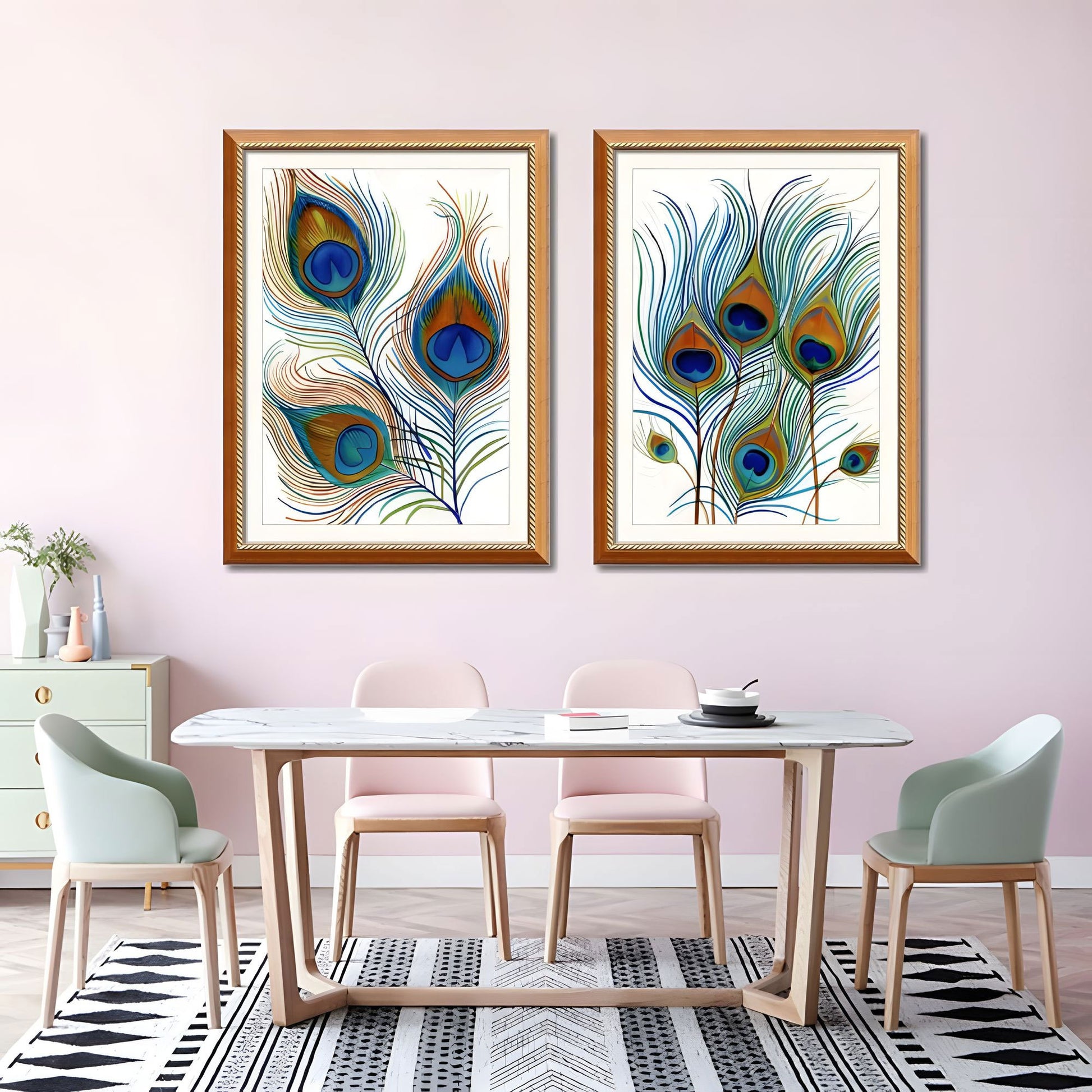 Set of 2 Peacock Feather Framed Wall Art – Replaceable Canvas Prints with Solid Wood Picture Frames, Elegant Botanical Wall Decor for Dining Room and Living Room 24x32 inches