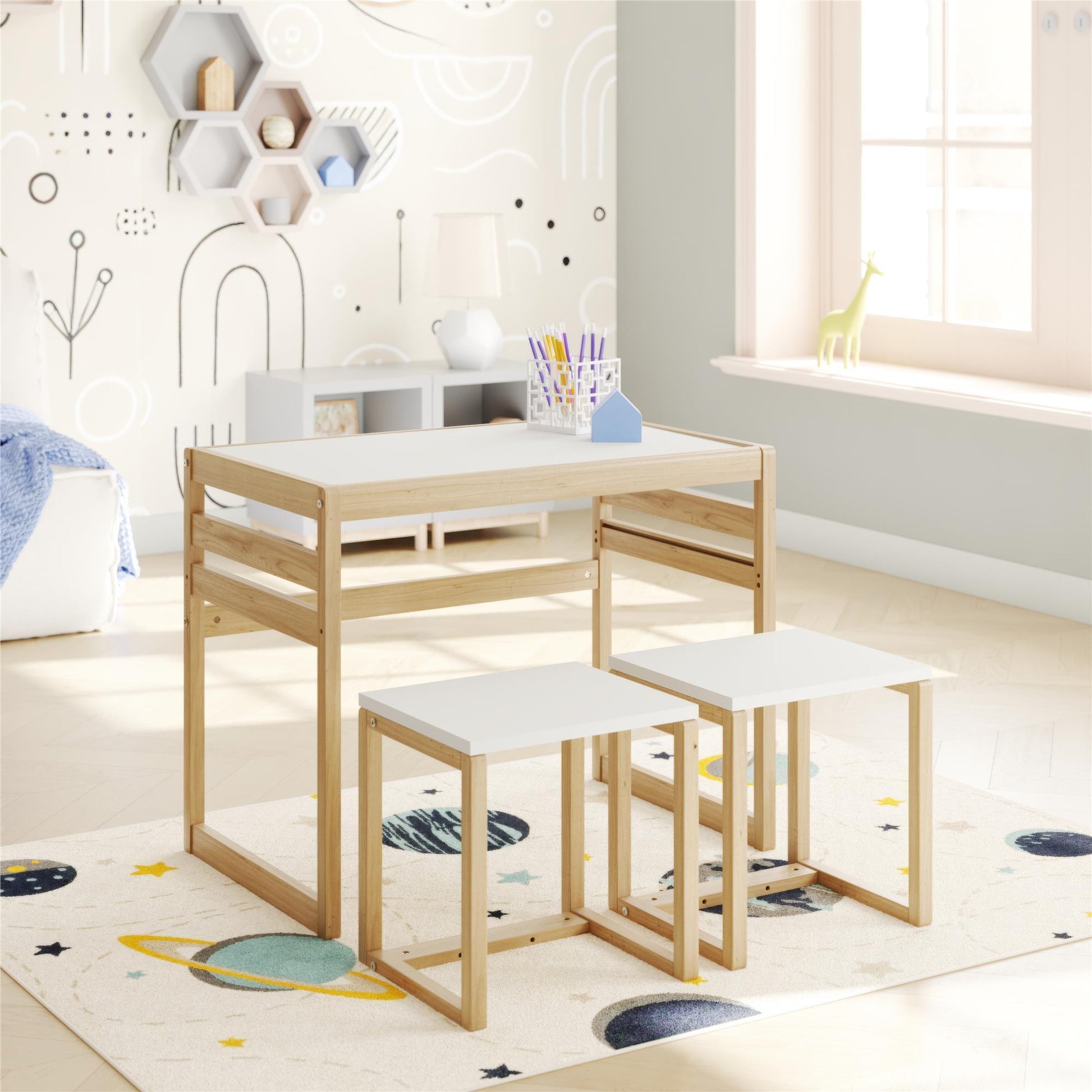 Chart a course for creativity with the Signy 3-Piece Kids' Table & Chair Set! This charming activity set includes one table and two chairs, providing the perfect launchpad for your children to host an impromptu tea party, craft their next macaroni masterpiece, or embark on an imaginative learning adventure. Designed to fit into kids' rooms, living rooms, nurseries, or playrooms, this Montessori-style set will bring joy to your little ones as they discover their special space to create, learn, and play. Parents will love how the Signy adapts to homeschool environments with raised borders to prevent crayons from rolling off, sturdy painted wood construction that withstands daily use, and stools that fit neatly under the table to save space. Perfect for toddlers and preschoolers, with adjustable chair and table heights that grow with your child, this lightweight set can be assembled and ready for play in 30 minutes.