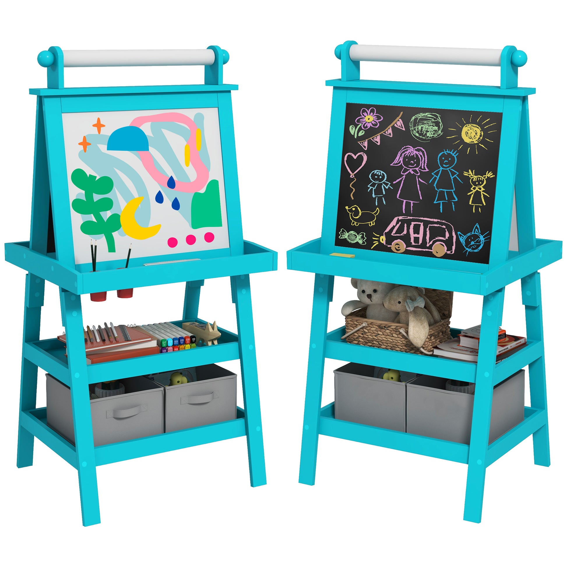 Qaba Easel for Kids, Double Sided Kids Art Easel with Paper Roll, Magnetic Whiteboard, Chalkboard & Storage, Standing Toddler Easel for Painting & Drawing, Gift for Boys, Girls Ages 3-6 Years, Blue