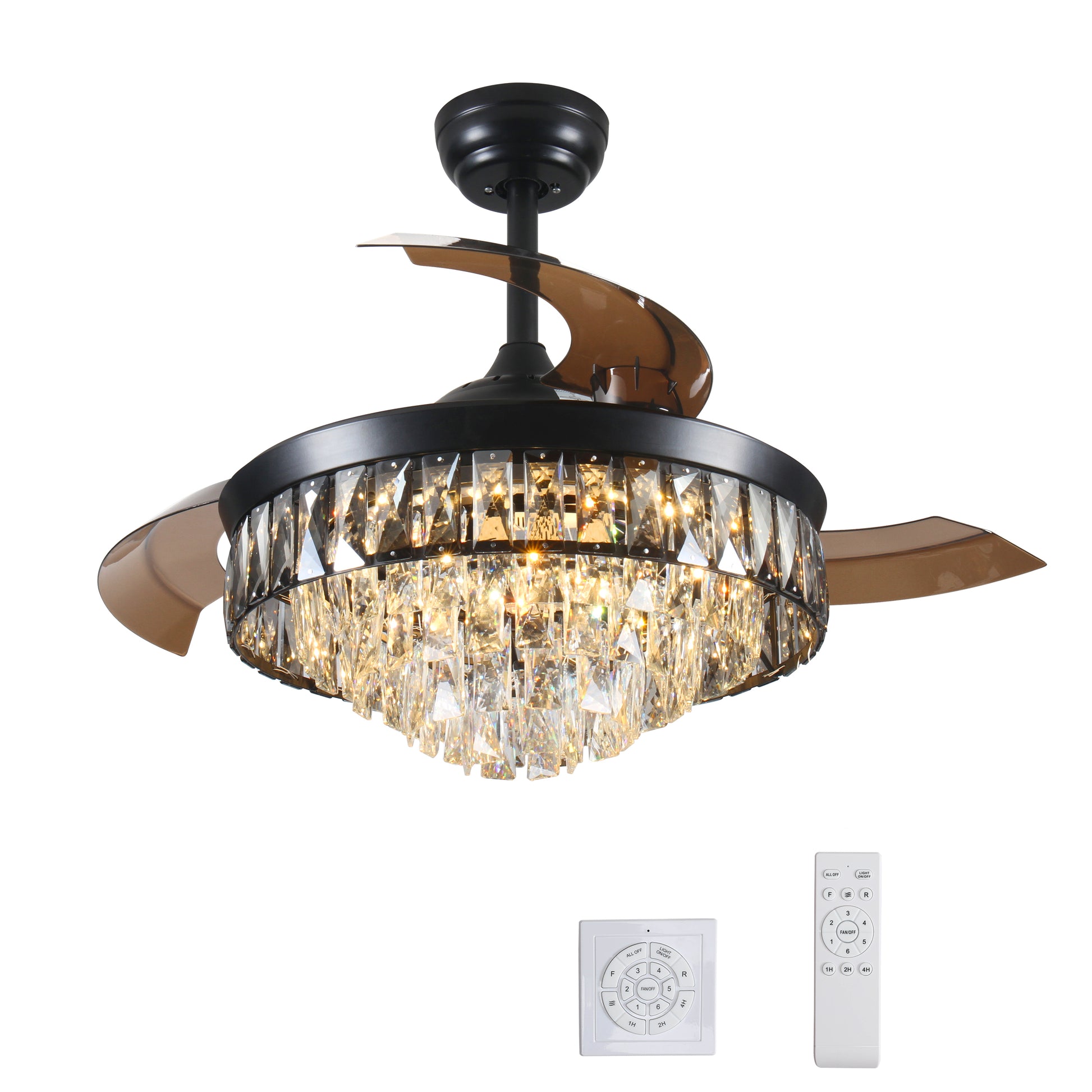 42'Chandelier Ceiling Fan Retractable Ceiling Fans with Lights and Remote Control 6 Speed 3 changable LED light Crystal black Ceiling Fan Modern Light for Bedroom Indoor Living Room