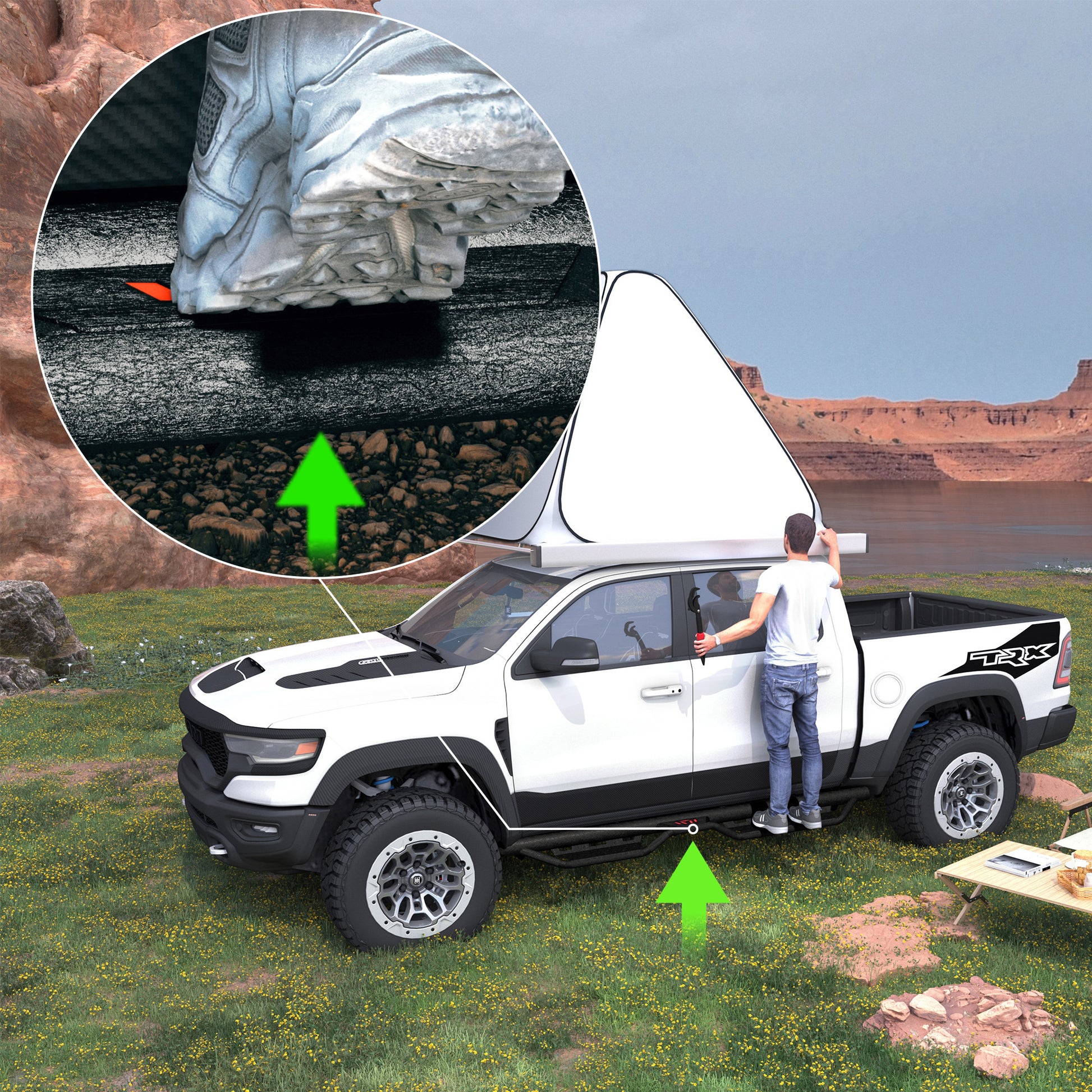 • Easy Installation: The step bars come with welded brackets for extra strength and stability. Installing them is quick and hassle-free, requiring minimal accessories and no cutting or drilling.Functional Convenience: With a two-stair layout, our step bars provide easy access for vehicles with lift kits and oversized wheel tires, making rooftop operations smoother and more convenient.