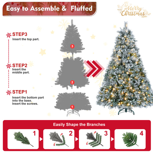 7.5FT Flocked Christmas Tree with 500 Warm White LED Lights – 1252 Tips, Snowy PVC & Hard Needle Branches, Hinged Design for Easy Setup, Sturdy Metal Stand – Full & Realistic Holiday Tree