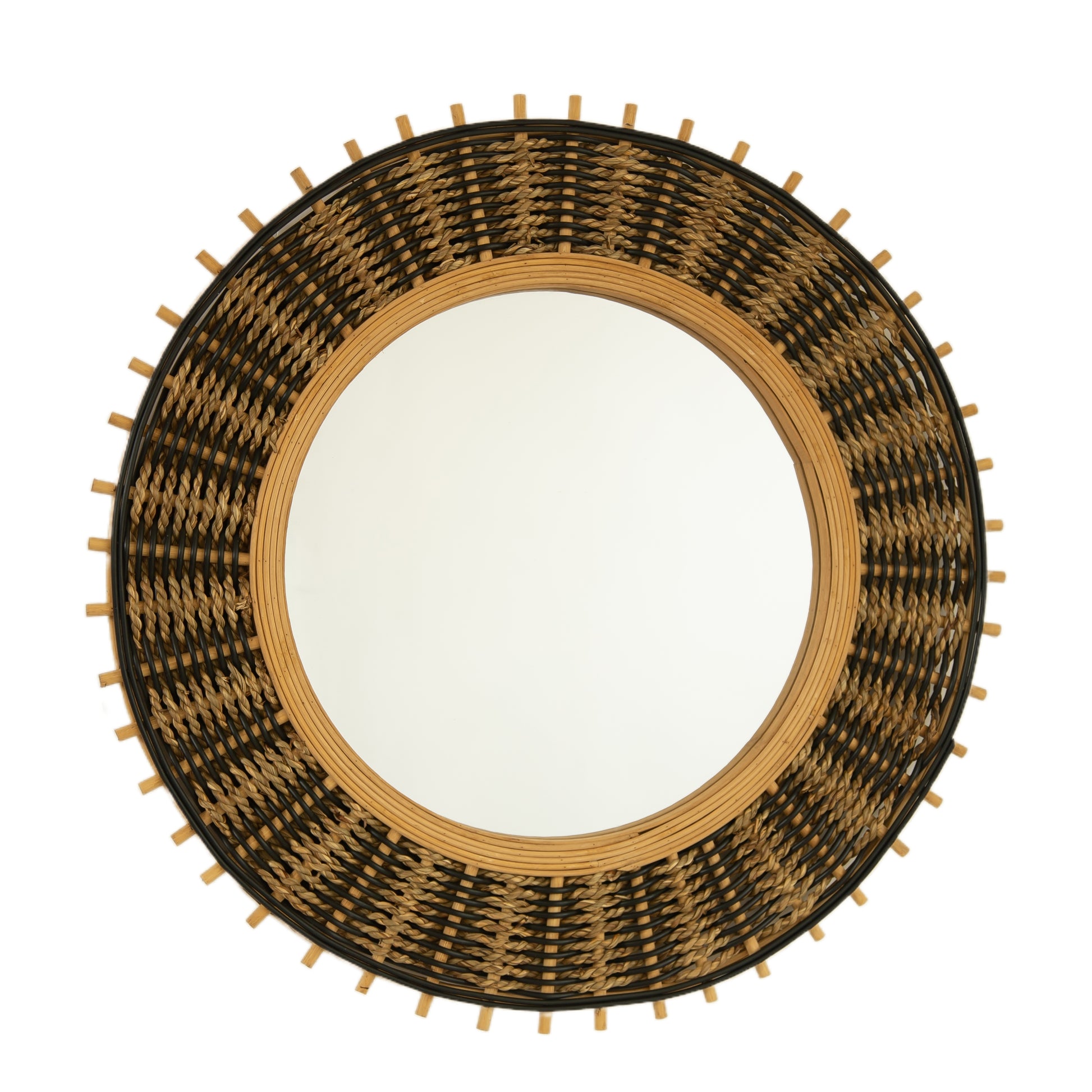 • Meticulously wrapped in light yellow and black hemp ropes, the mirror showcases artisan craftsmanship through its orderly woven pattern.