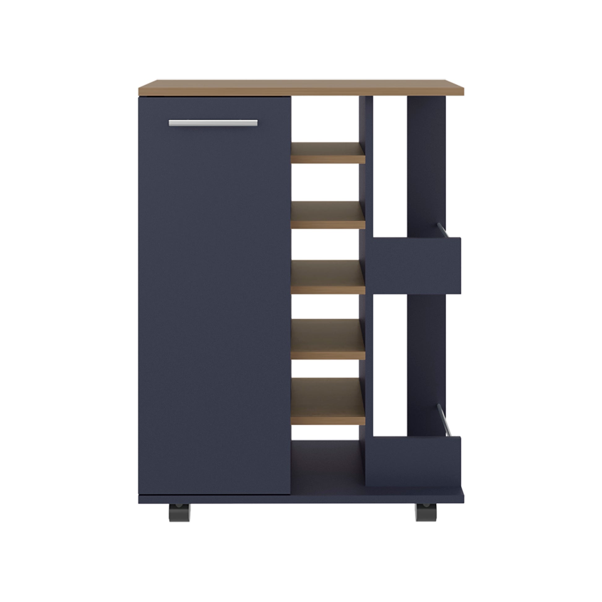 Bar Cart, Two External Shelves, Four Casters, Six Built-In Wine Rack, Single Door Cabinet, Natural Oak, Navy Blue