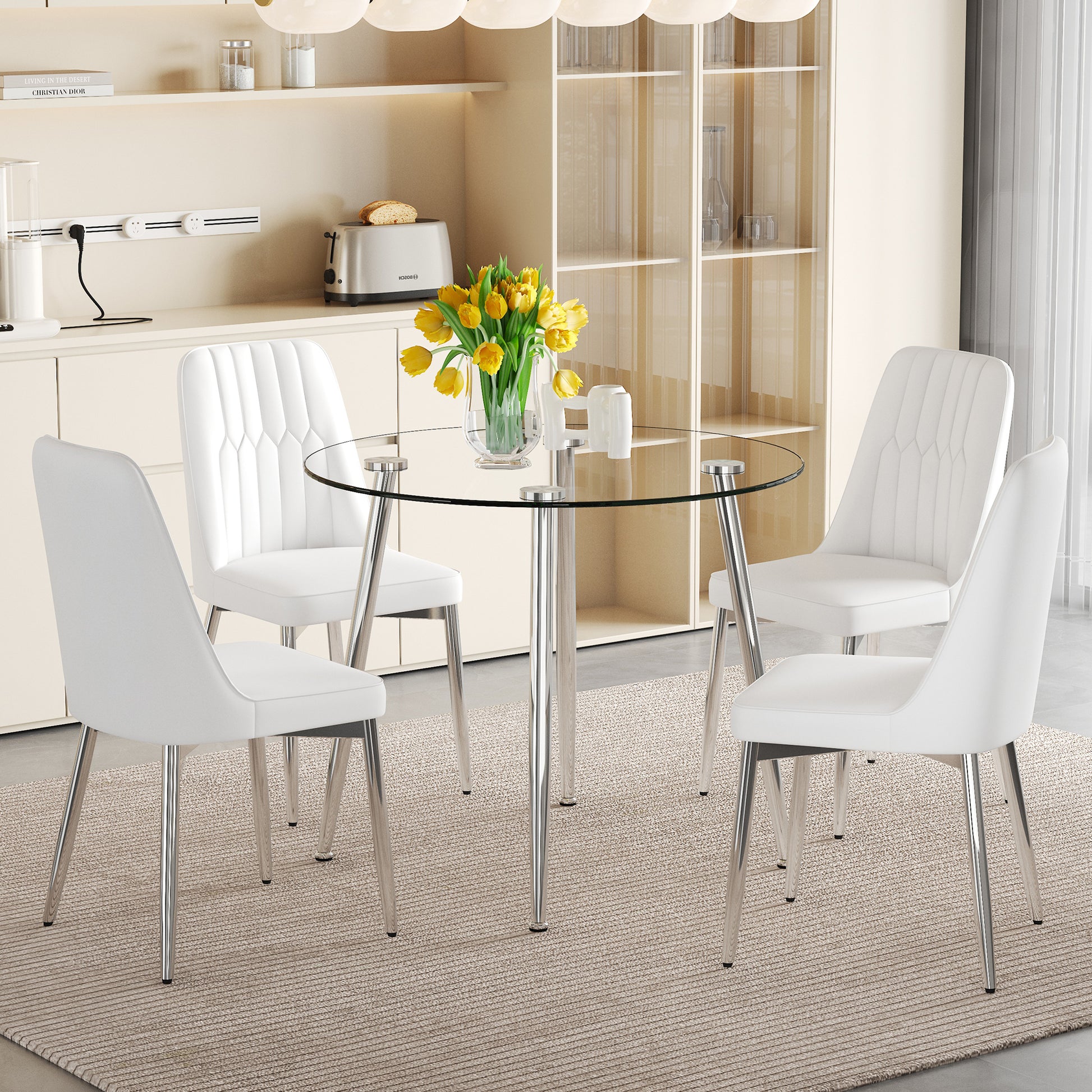 Table and chair set.36 Inch Diameter Modern Luxury Glass Dining Table and Chair Set - Silver Metal Legs.Paired With 4 White Chairs With PU Cushions And Silver Metal Legs.