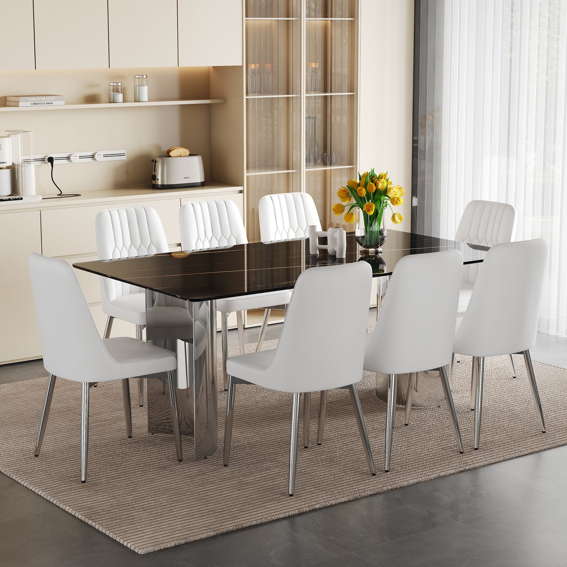 Table and chair set. Modern and Minimalist Dining Table. Imitation Marble Glass Sticker Desktop,Stainless Steel Legs .Paired with 8 White Chairs With PU Cushions And Silver Metal Legs.