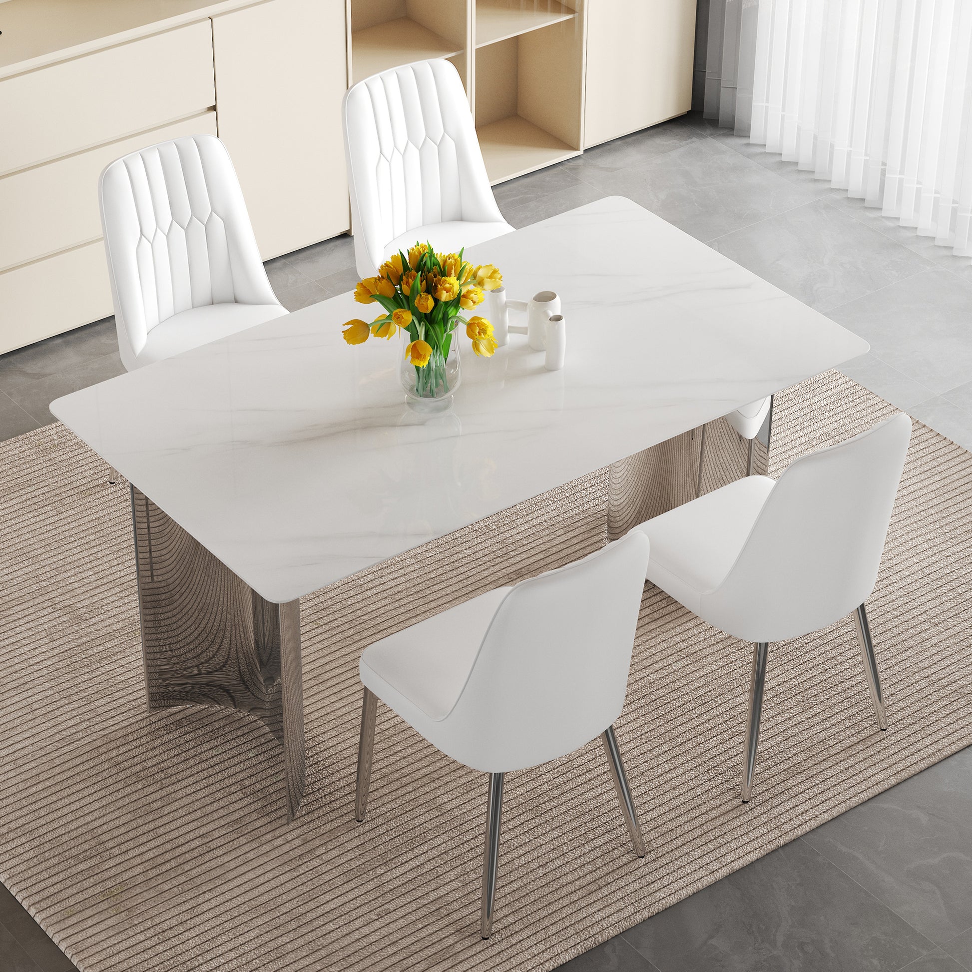 Table and chair set. Modern and Minimalist Dining Table. Imitation Marble Glass Sticker Desktop,Stainless Steel Legs .Paired with 4 White Chairs With PU Cushions And Silver Metal Legs.